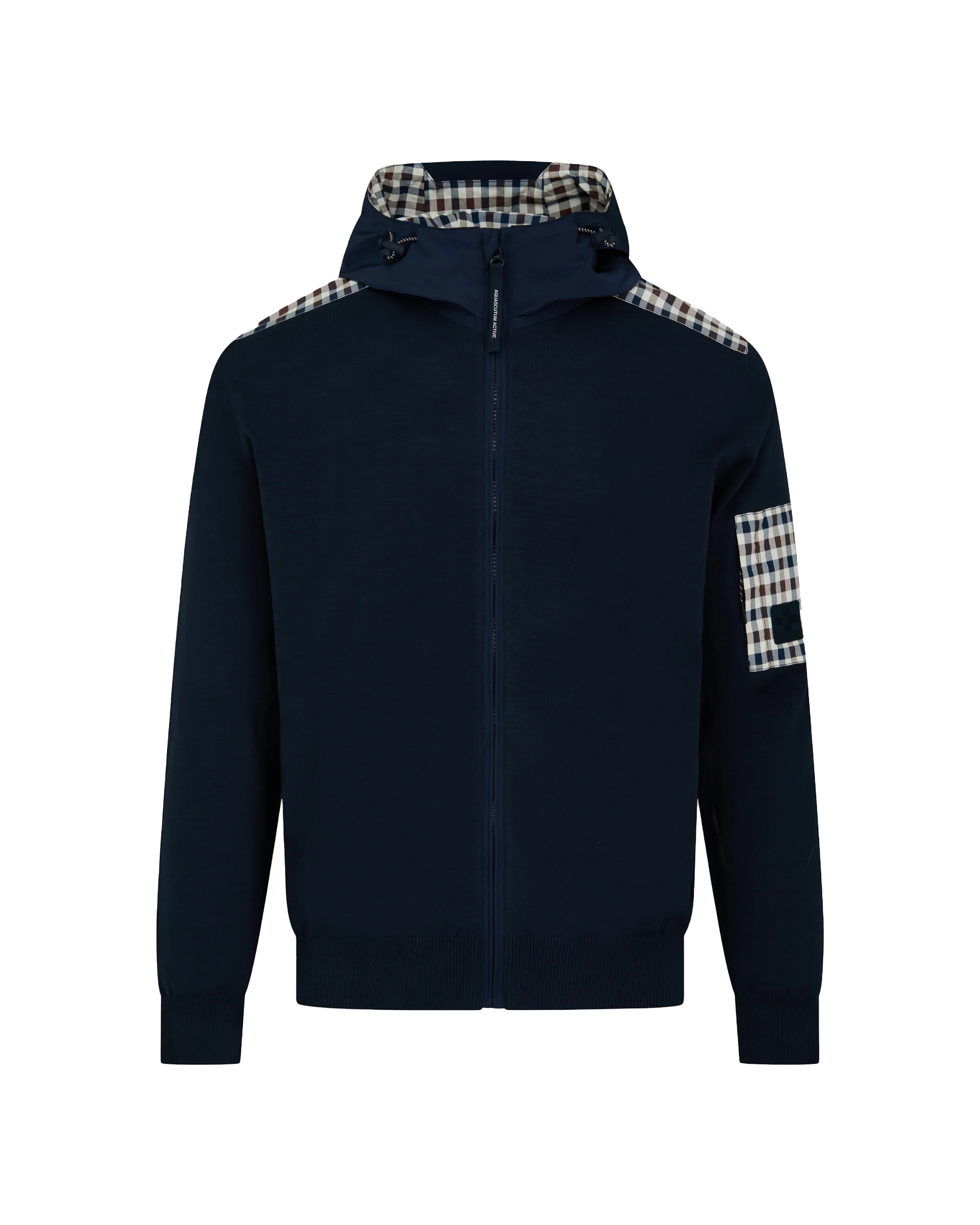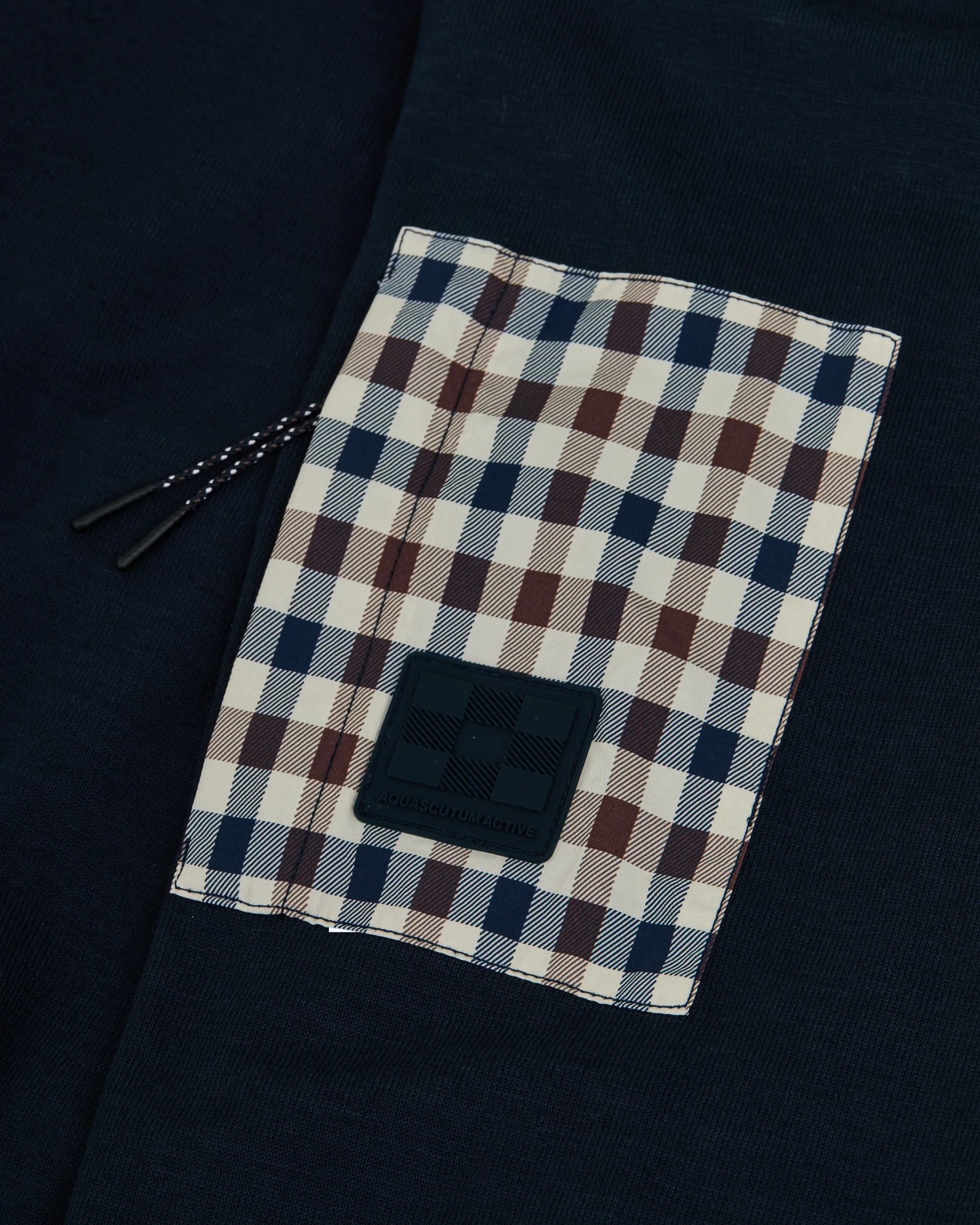 De hoodie is voorzien van een gelamineerde capuchon met subtiel tone-on-tone Aquascutum Active logo op de voorzijde en verstelbare trekkoorden voor een optimale pasvorm en extra bescherming. De binnenzijde van de capuchon is afgewerkt met het iconische Club Check patroon, wat zorgt voor een herkenbare, luxe uitstraling.