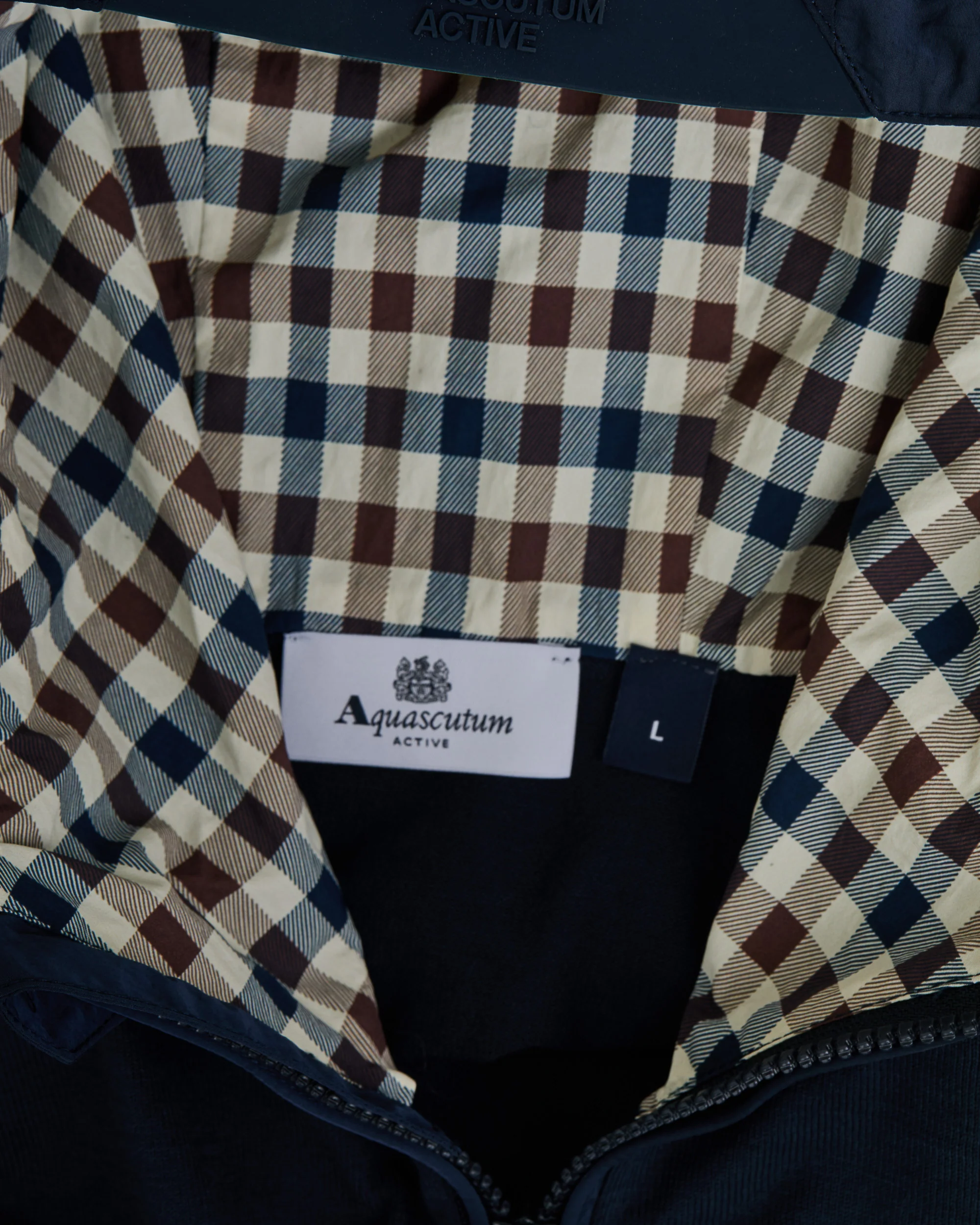 Op de mouw bevindt zich een technische lamina stof pocket met Club Check design en een contrasterende Aquascutum Active rubber badge – een krachtig stijlstatement binnen de Active-lijn.