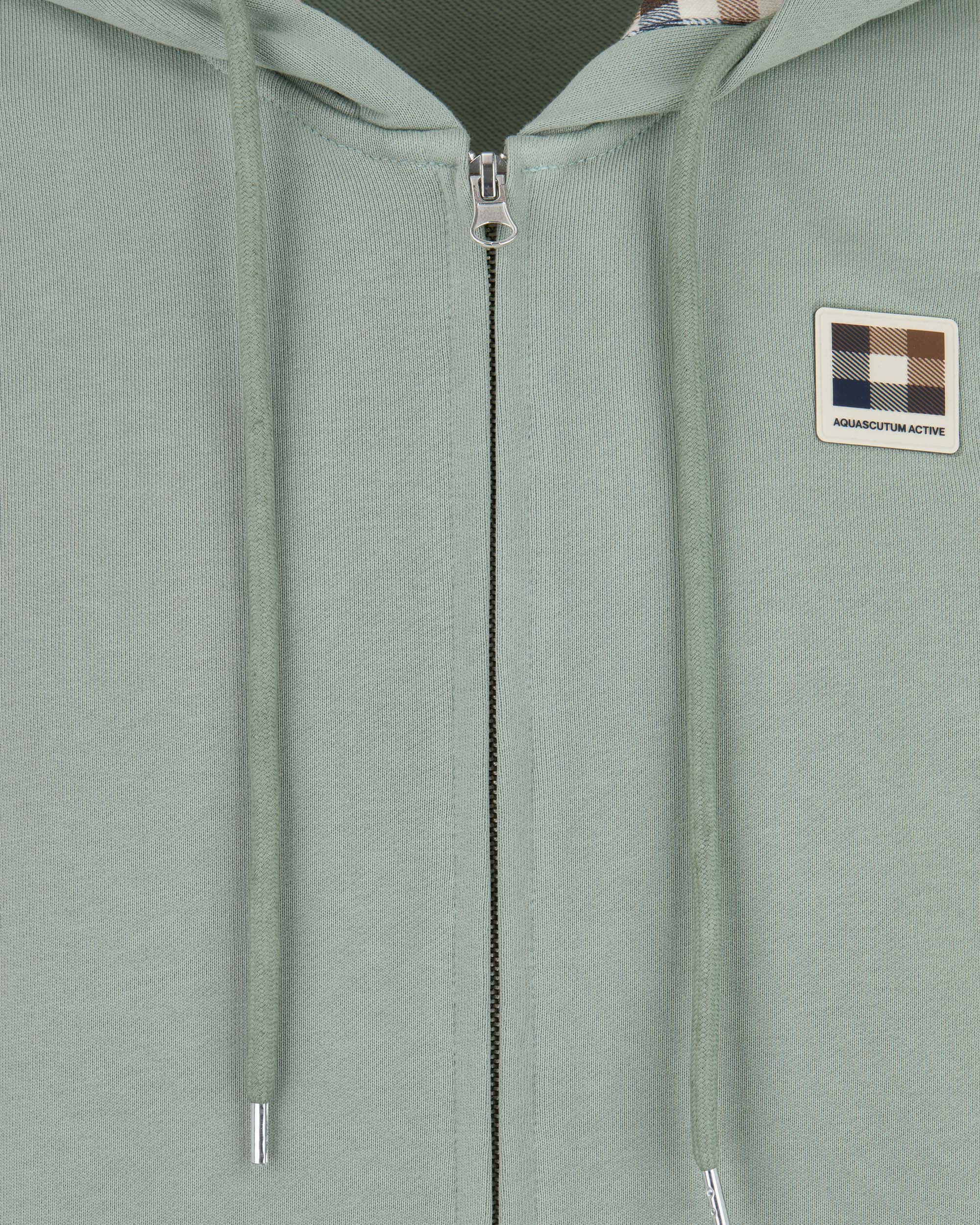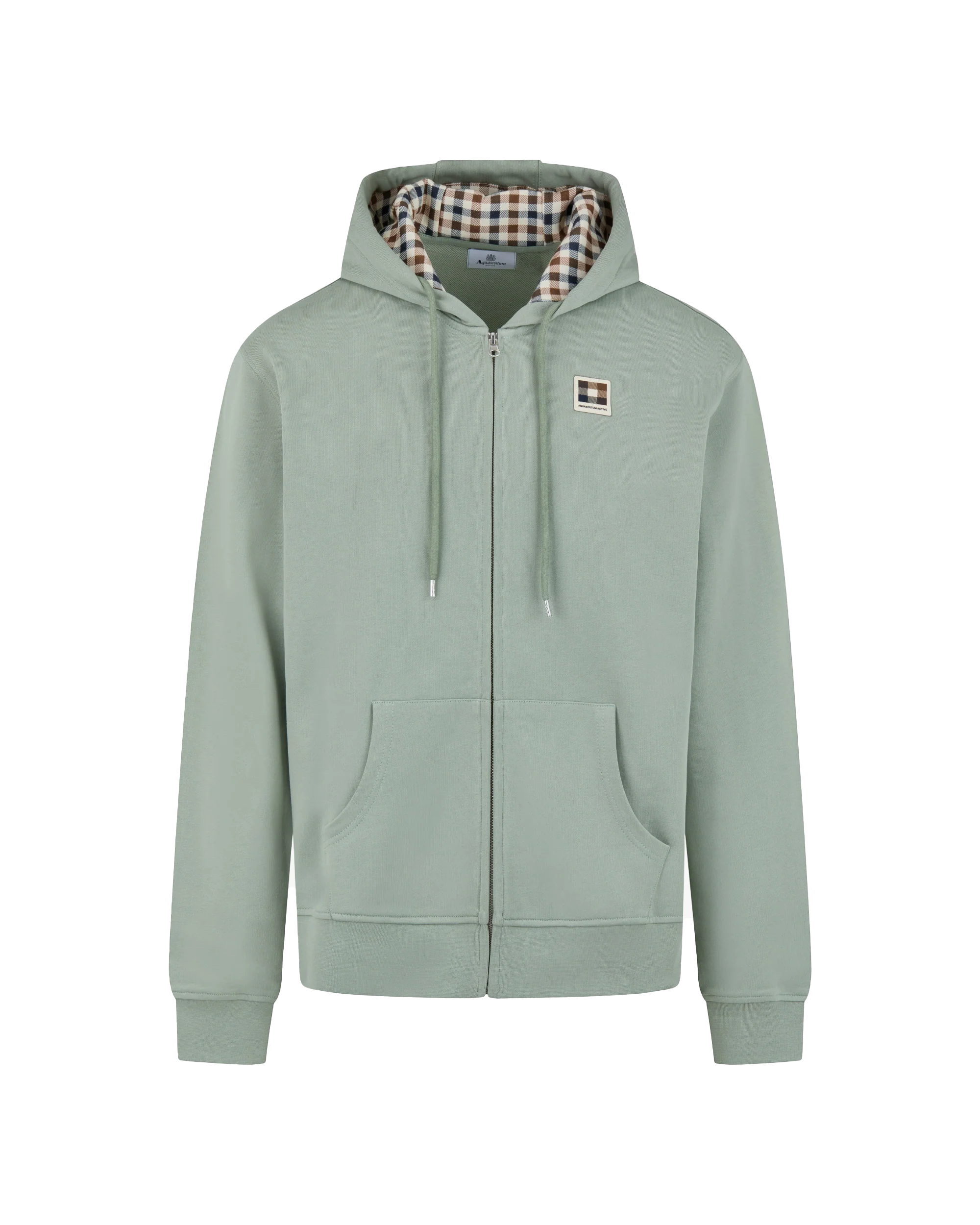 Het ontwerp is voorzien van een volledige ritssluiting, een klassieke capuchon met iconische Club Check voering en een praktische kangoeroezak aan de voorkant. De subtiele Aquascutum Active badge op de linkerborst zorgt voor een minimalistische en stijlvolle branding met een moderne uitstraling.
