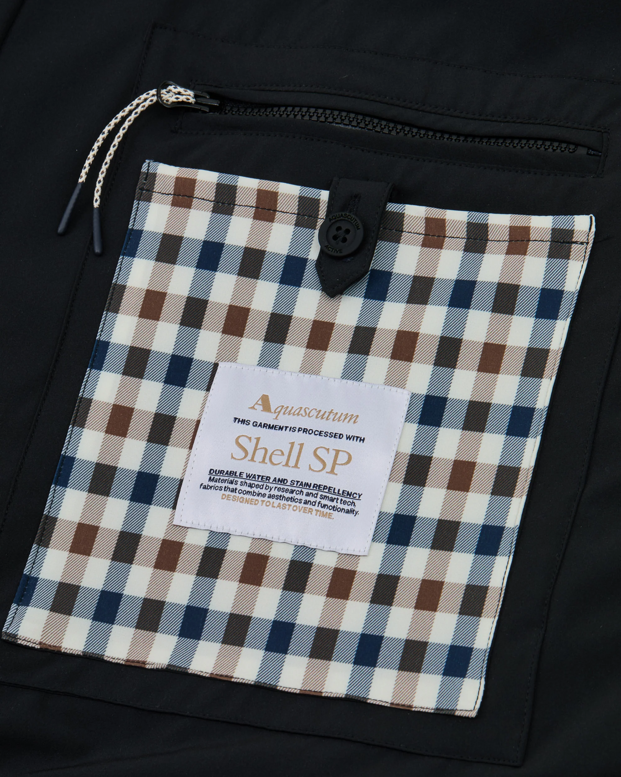 De iconische Aquascutum Active silicone badge op de mouw benadrukt het premium karakter en de technische identiteit van het design.
