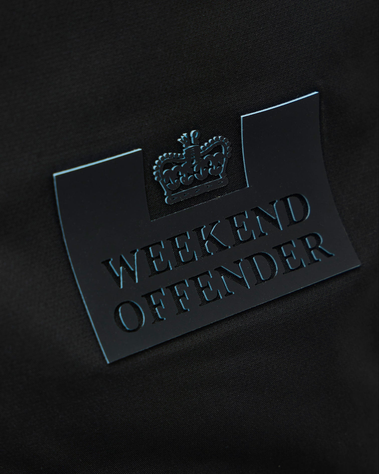 Dubbel WO “prison print” logo met contrasterend profiel op het beenzakpaneel als kenmerkende signatuur.